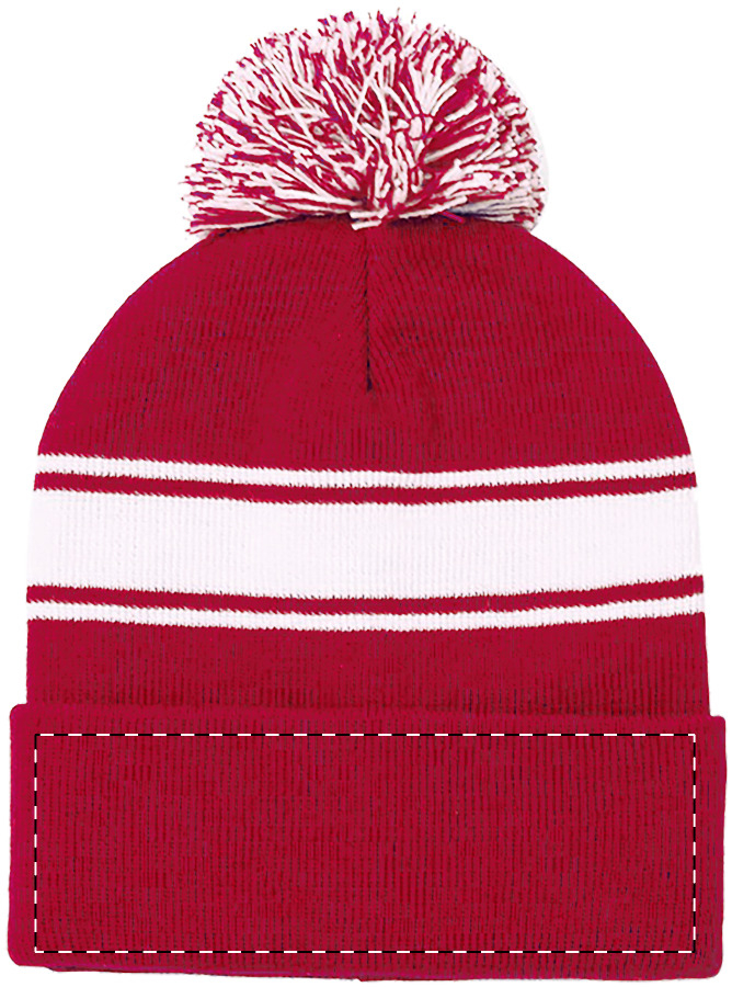 Cappello invernale in acrilico con strisce bianche e pompon coordinato.
