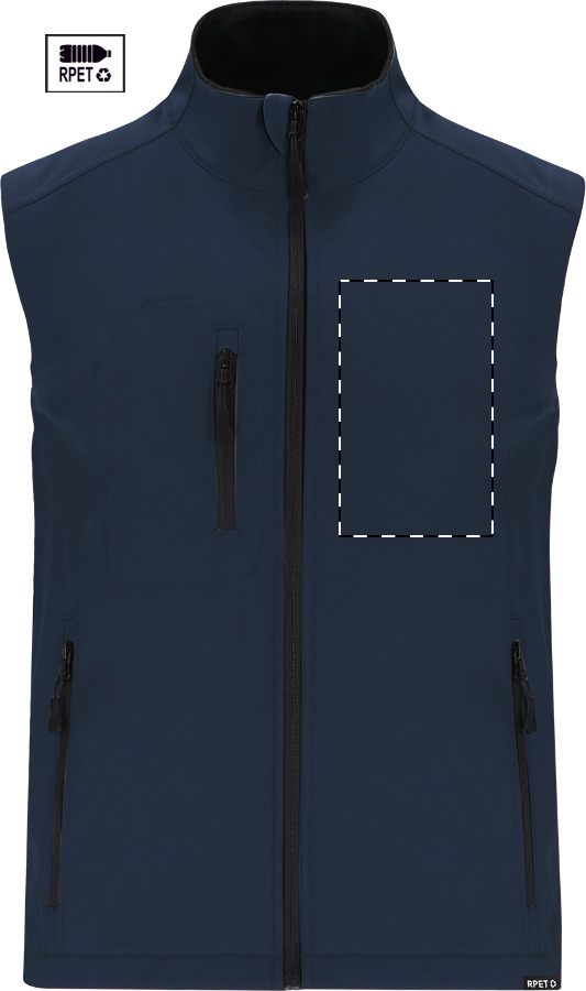 Gilet in softshell RPET a triplo strato, antivento ed impermeabile, con tasche laterali e sul petto chiuse da zip. Materiale esterno: 94% poliestere RPET e 6% elastan - Interno: 100% pile di poliestere RPET. Peso: 340 g/m².
