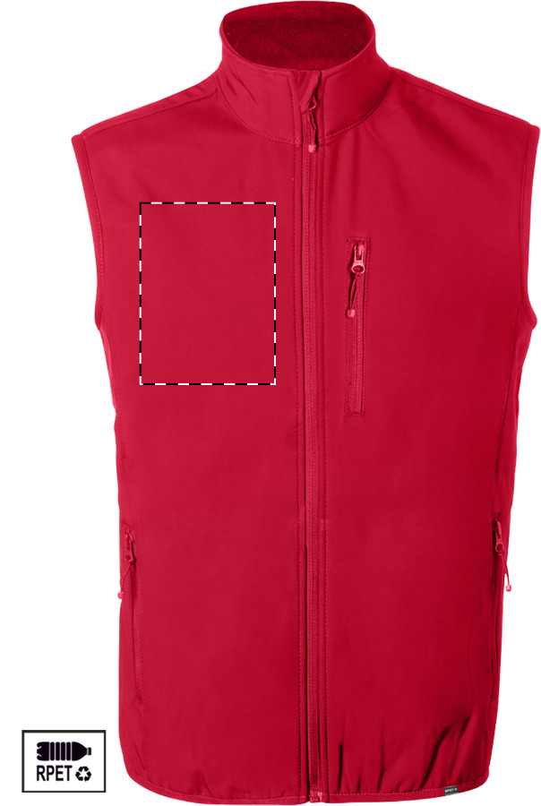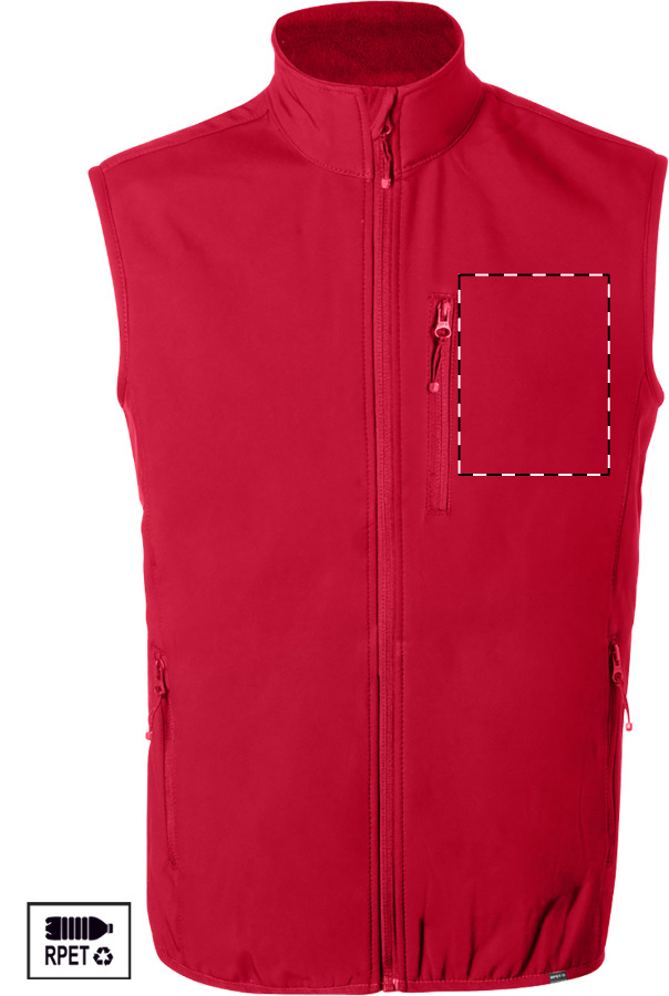 Gilet in softshell RPET traspirante, impermeabile e antivento con zip e tasche sul petto e laterali. Esterno: 92% poliestere RPET e 8% elastan. Interno: micropile in 100% poliestere RPET. 300 g/m².