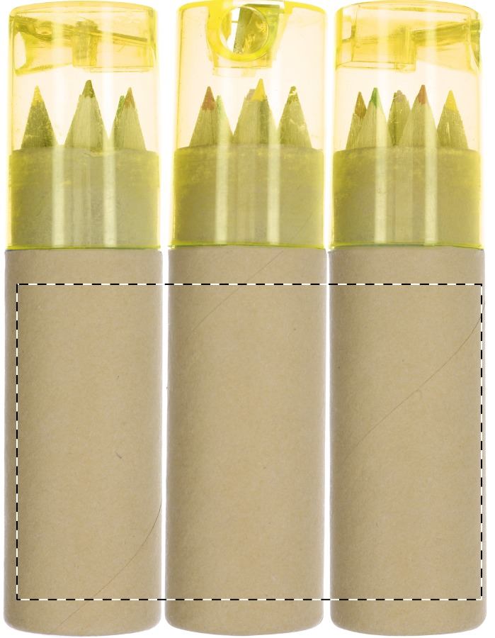 Set 6 matite colorate in confezione cilindrica di cartoncino con temperino in plastica.