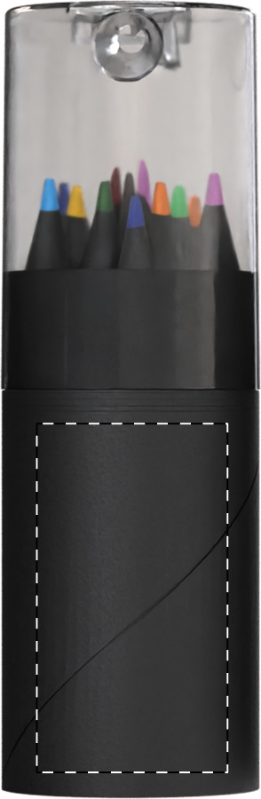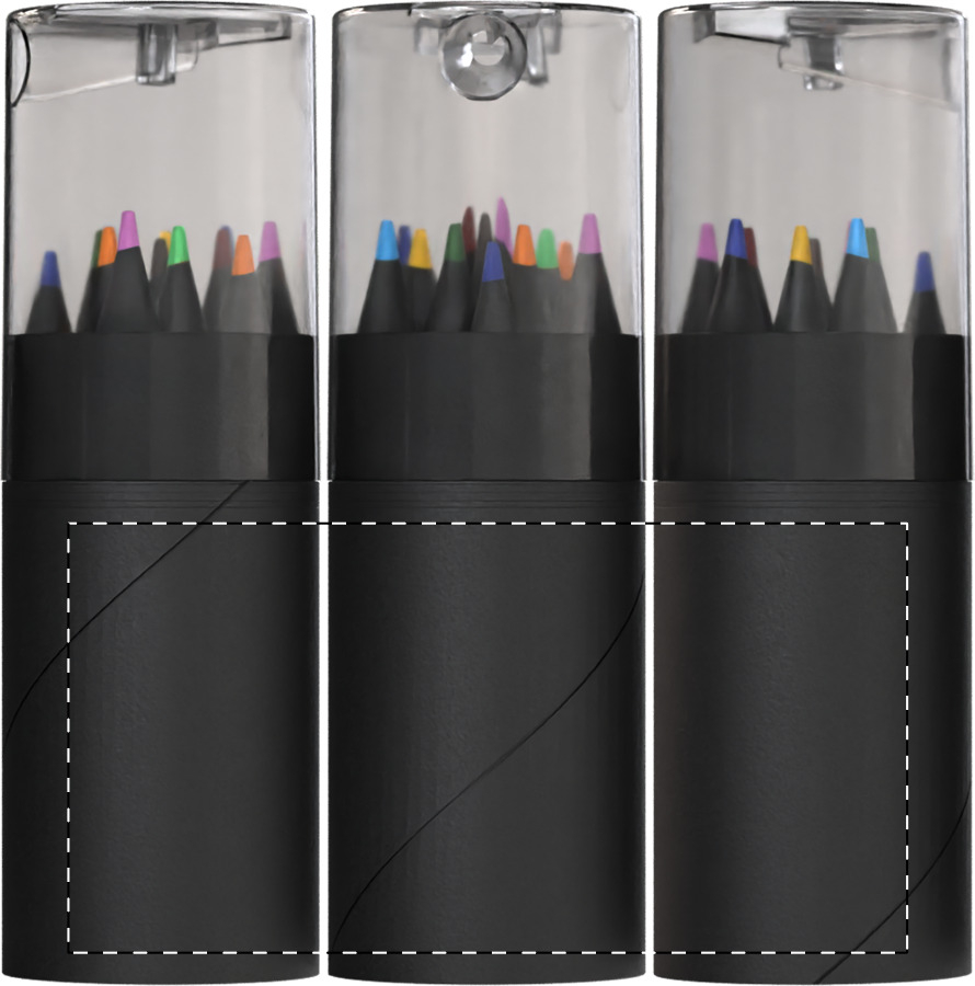 Set di 12 matite in legno nero contenute in un astuccio di cartoncino nero e temperamatite in plastica.