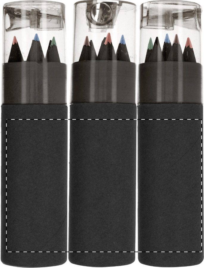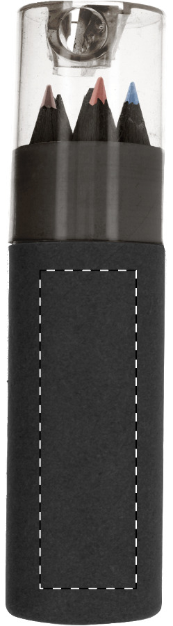 Set di 6 matite in legno nero contenute in un astuccio di cartoncino nero e temperamatite in plastica.