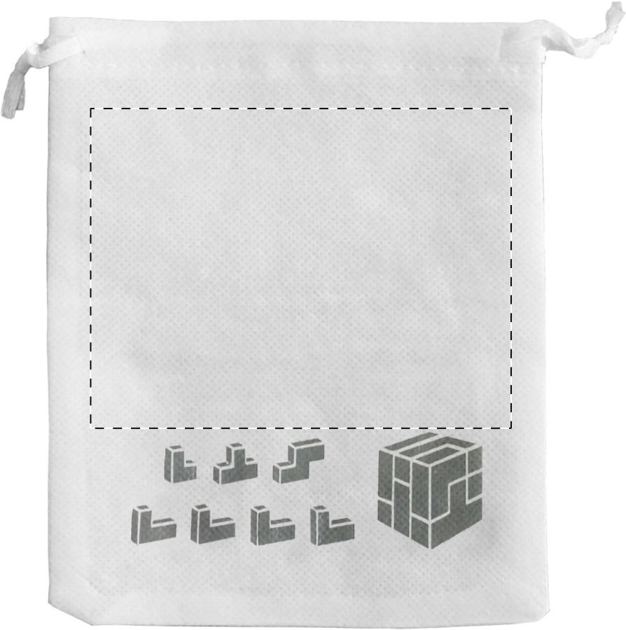 Puzzle cubo magico in legno colorato in sacchetto di TNT. Dimensione sacchetto: 123×150 mm.