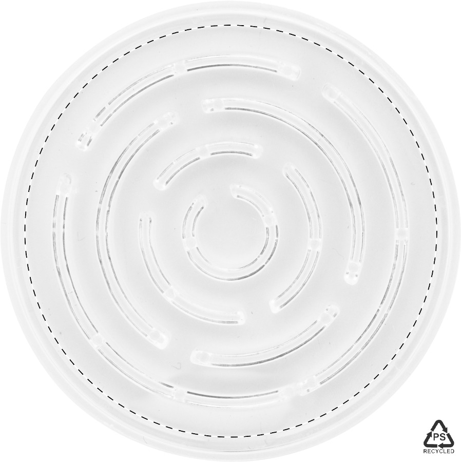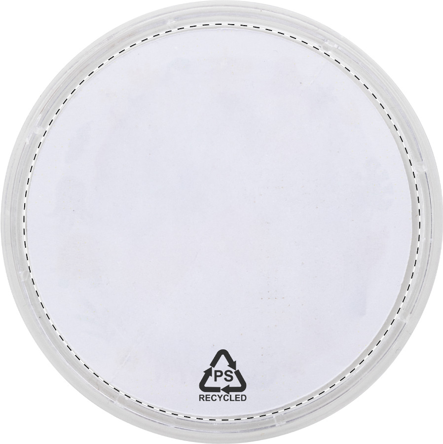 Gioco di abilità in PS riciclato di forma rotonda, con tre palline di metallo ed inserto in carta personalizzabile a colori. Il costo comprende la stampa digitale su entrambi i lati. MOQ: 100 pezzi.
