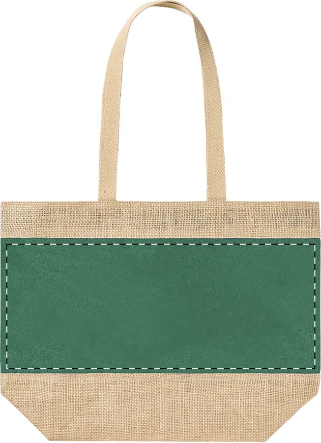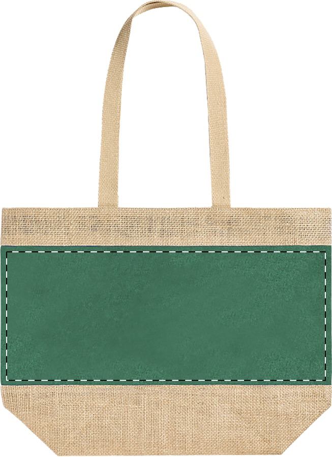 Borsa da spiaggia colorata in combinazione di juta e cotone laminati con manici lunghi.