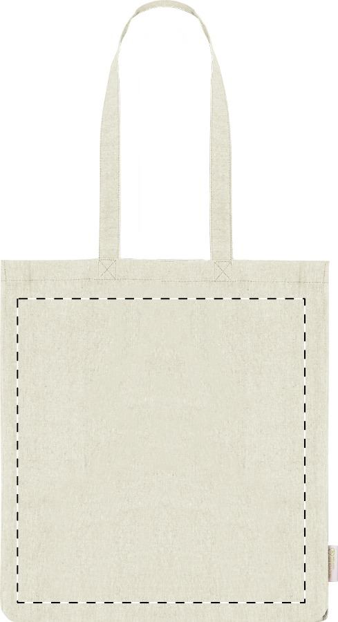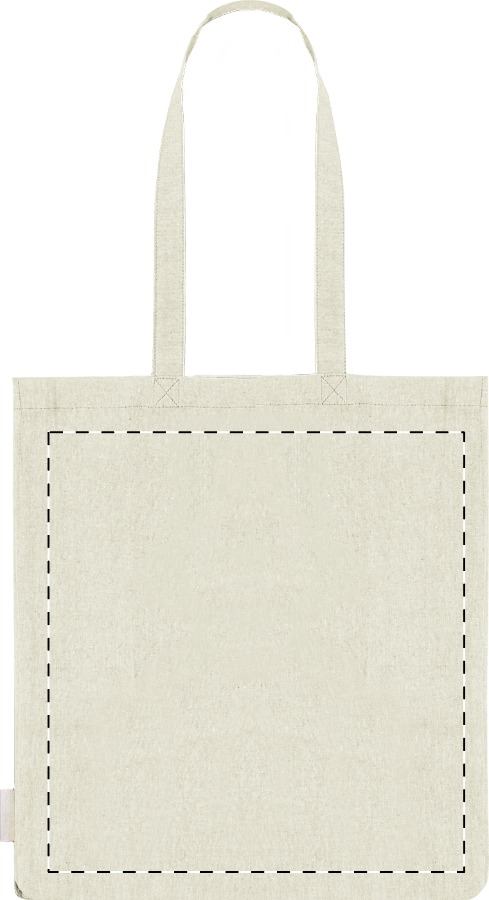 Borsa per la spesa in 100% cotone riciclato, 140 g/m². con soffietto, manici lunghi ed etichetta cotone riciclato.
