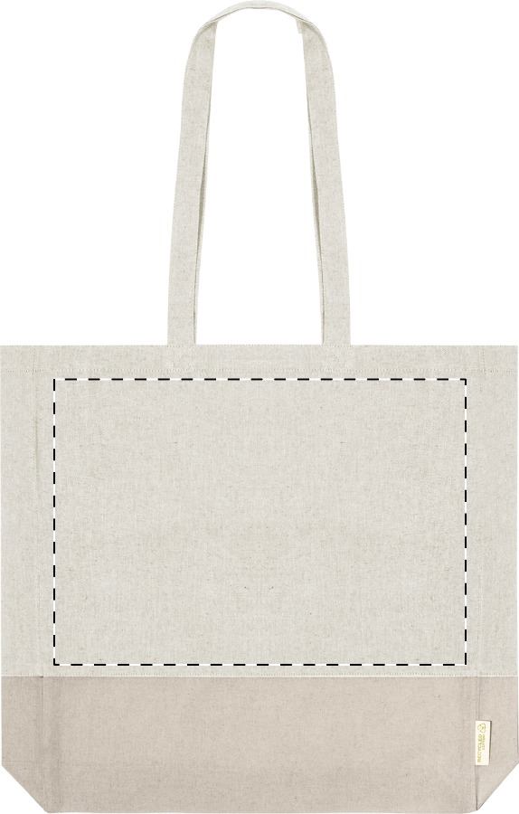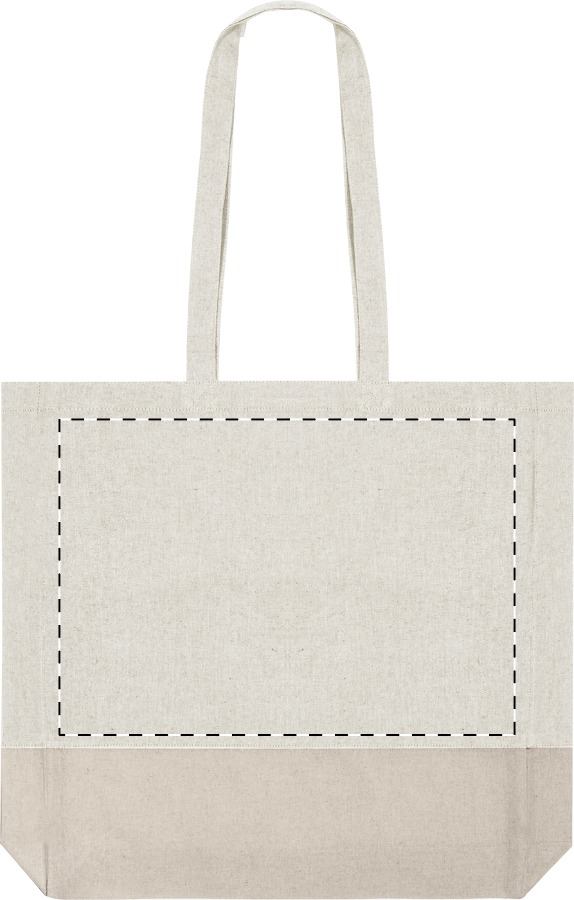 Borsa per la spesa bicolore in 100% cotone riciclato 120 g/m². con manici lunghi, soffietto ed etichetta cotone riciclato.
