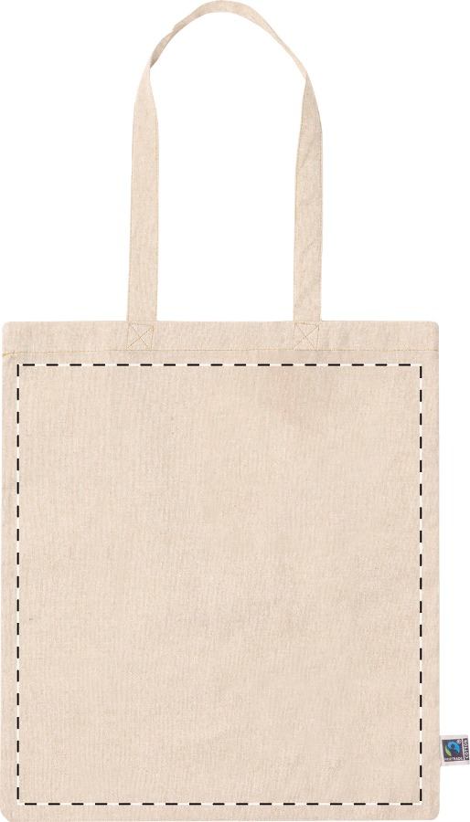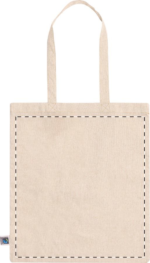 Borsa per la spesa in cotone riciclato equosolidale con manici lunghi. 100% cotone Fairtrade, 120 g/m². ed etichetta Fairtrade.