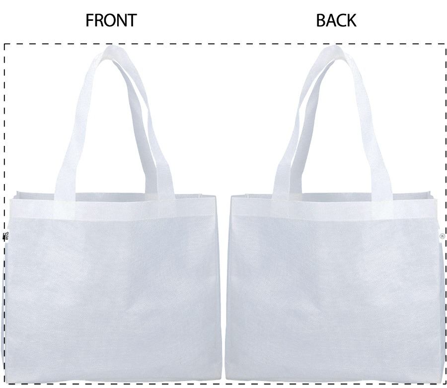 Borsa per la spesa in tessuto non tessuto RPET con soffietto e manici lunghi, 80 g/m². Con grafica stampata in sublimazione su tutta la superficie ed etichetta RPET. MOQ: 25 pz.