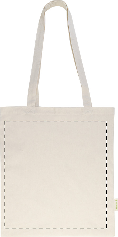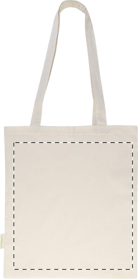 Shopper con manici lunghi in 70% cotone riciclato e 30% poliestere RPET da 140 g/m² ed etichetta cotone riciclato.