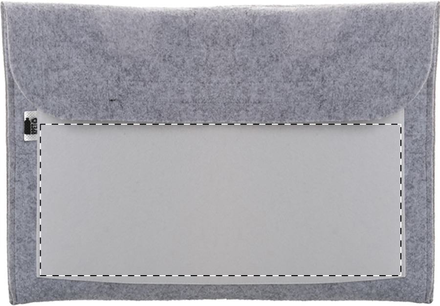 Custodia per computer portatile in feltro RPET personalizzabile, con tasca frontale stampata a colori, chiusura in velcro ed etichetta RPET. Adatto per computer portatili fino a 15". Il costo include la stampa in sublimazione. MOQ: 25 pezzi.