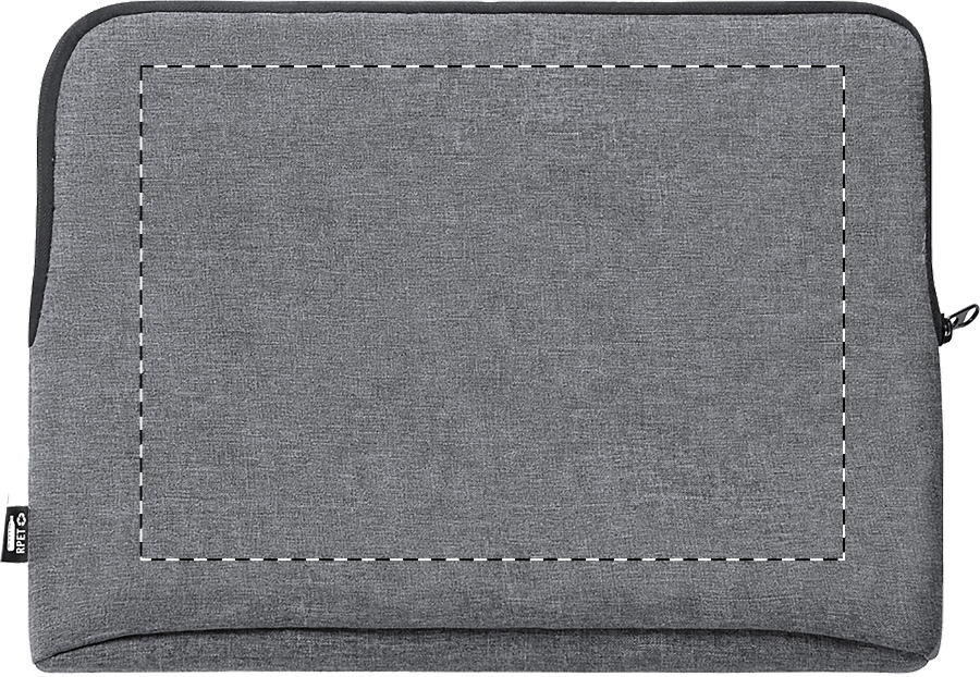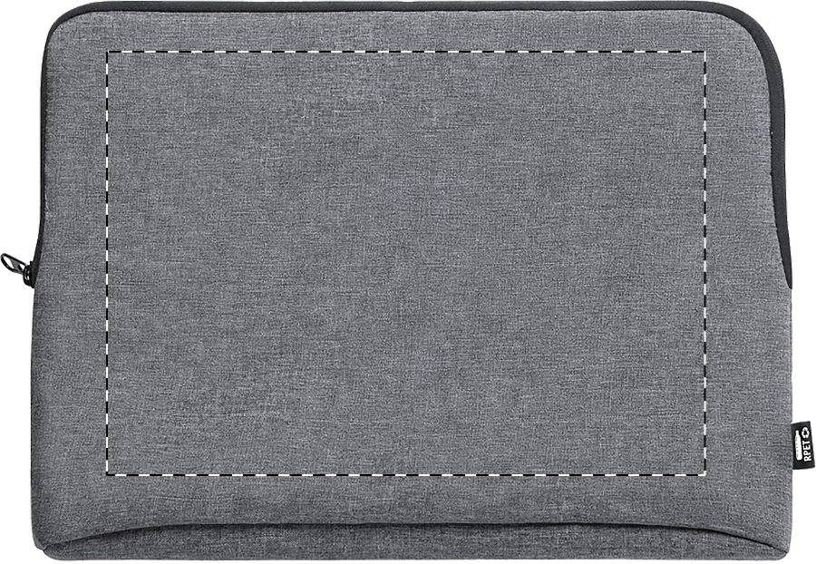 Custodia per laptop in poliestere 600D RPET con scomparto chiuso da cerniera, imbottitura interna ed etichetta RPET.