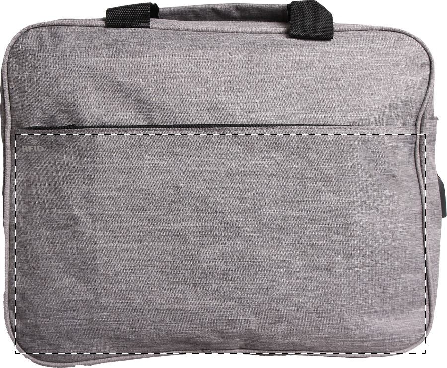 Borsa documenti con protezione RFID con scomparto imbottito per laptop e tablet (15" e 10"), schienale e tracolla imbottiti. Con connettore USB integrato per power bank. Poliestere 300D.