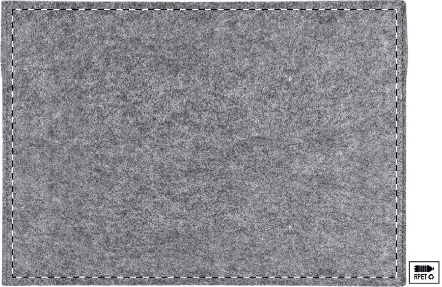 Cartella per computer portatile in feltro RPET con tasca frontale, chiusura in velcro ed etichetta RPET.