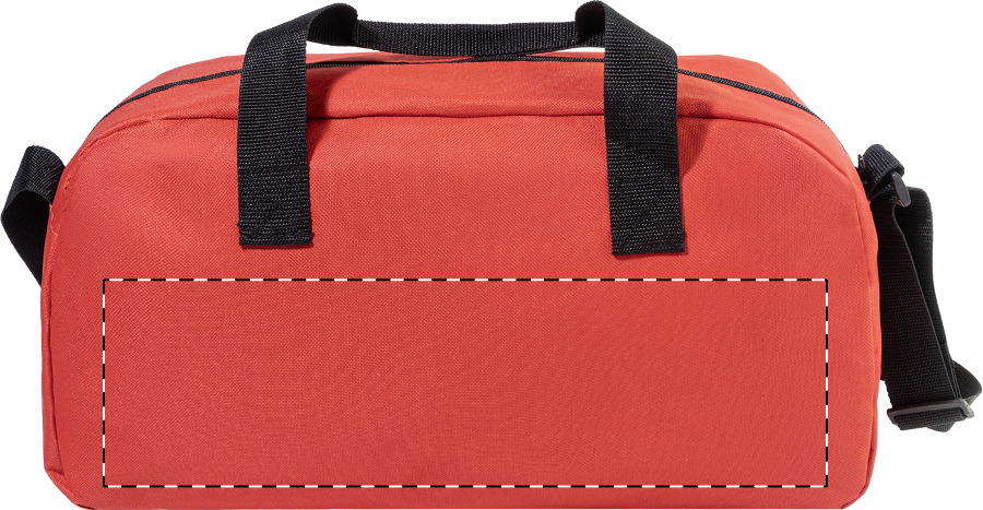 Borsa sportiva in poliestere 600D RPET con scomparto principale e tasca frontale chiusi da cerniera, strisce riflettenti, tracolla regolabile ed etichetta RPET.