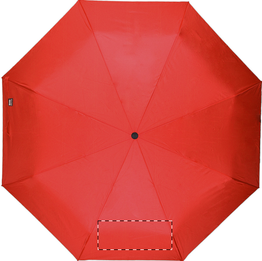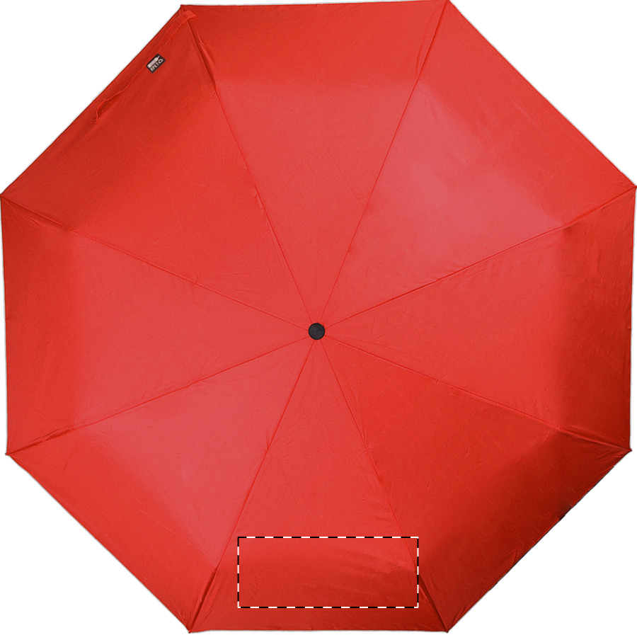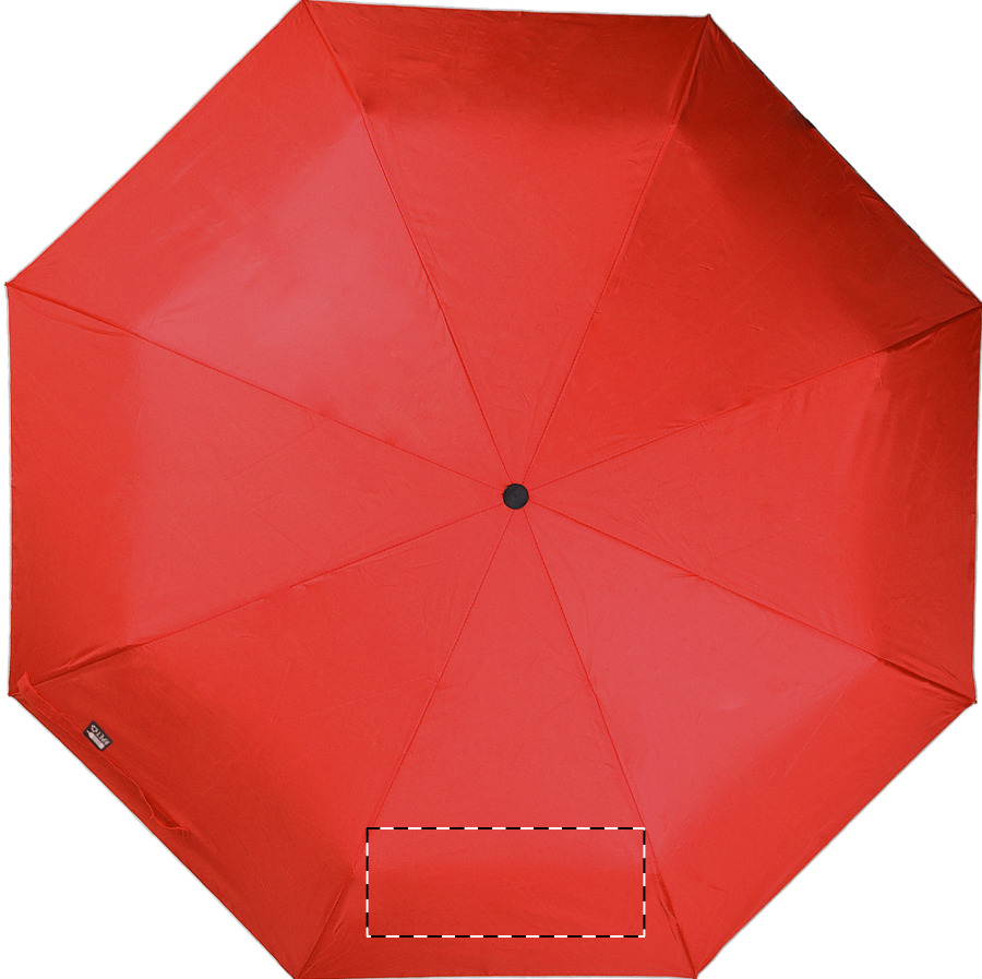 Ombrello pieghevole completamente automatico (apertura/chiusura) in pongee RPET 190T, antivento, con 8 pannelli e astuccio in colore coordinato. Struttura in metallo, stecche in fibra di vetro, manico gommato ad anello con moschettone ed etichetta RPET.
