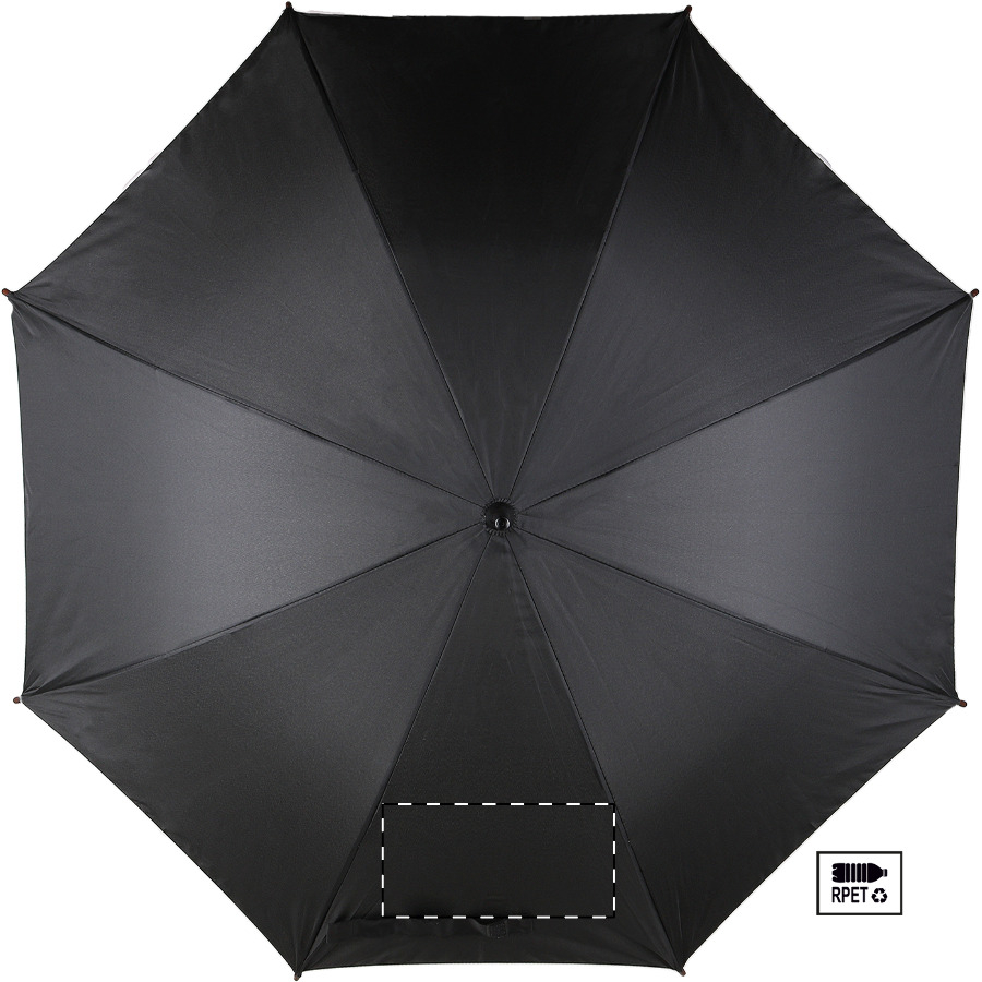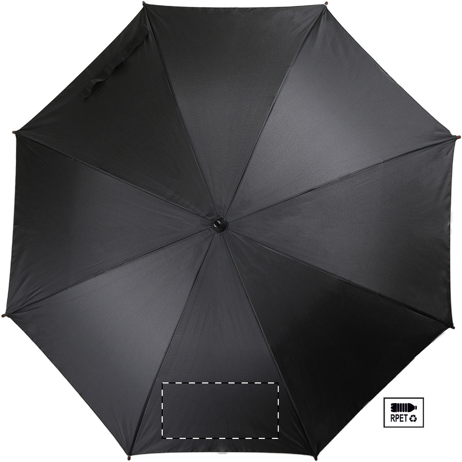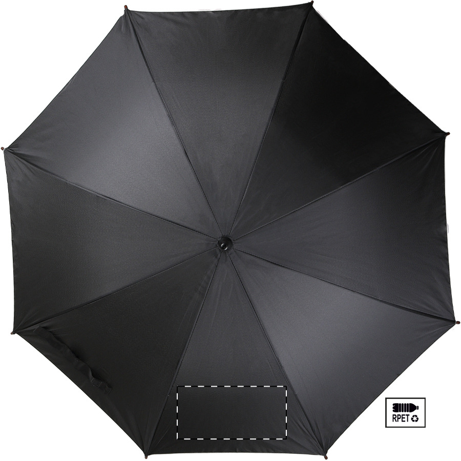 Ombrello automatico, antivento a 8 pannelli, manico in legno, struttura metallica e stecche in fibra di vetro. Materiale: Pongee RPET. Con fodera brandizzata. Prodotto a marchio André Philippe.