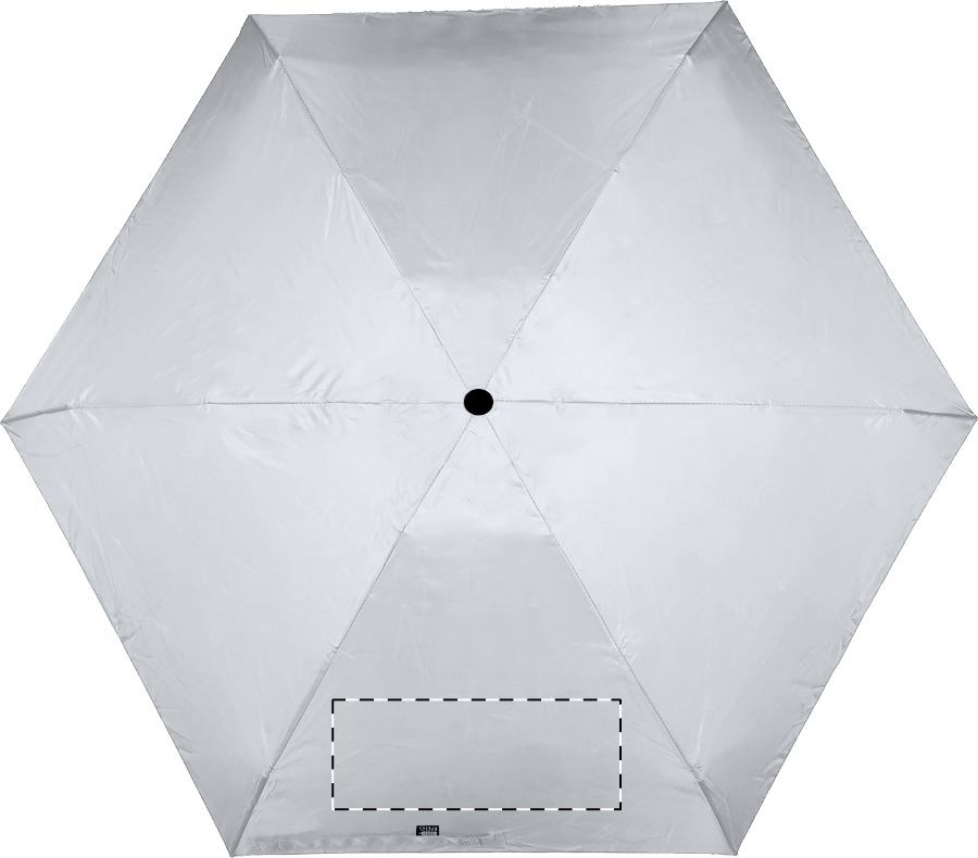 Mini ombrello manuale antivento a 3 elementi con 6 pannelli, struttura in metallo, stecche in fibra di vetro, manico in bambù, custodia in colore coordinato e laccetto in cotone. Materiale pongee RPET 190T ed etichetta RPET.