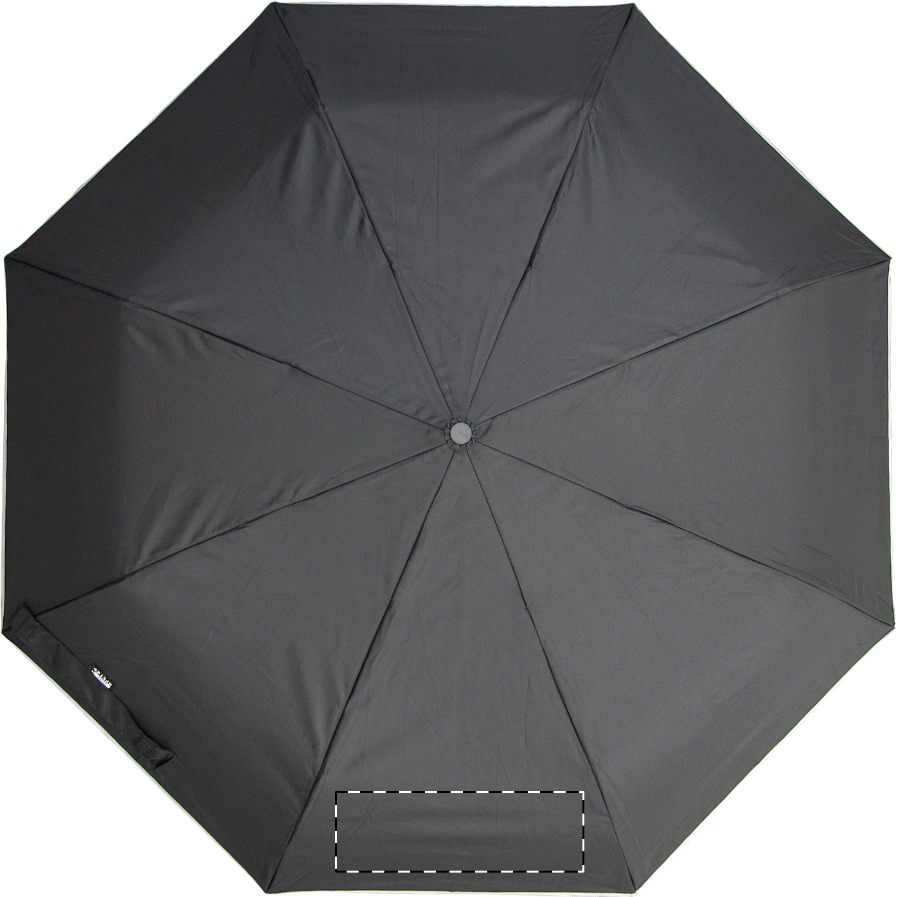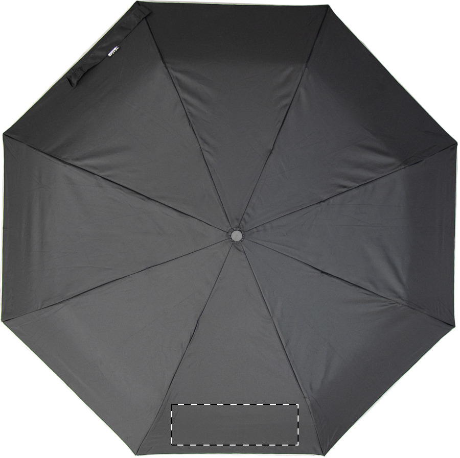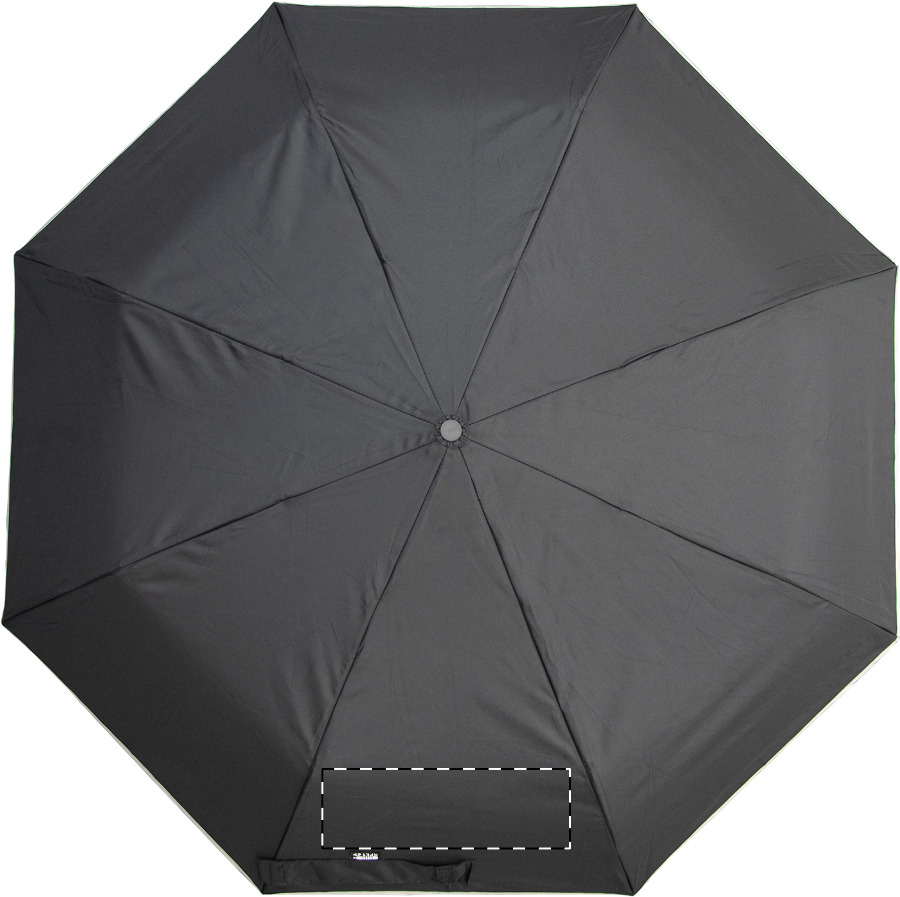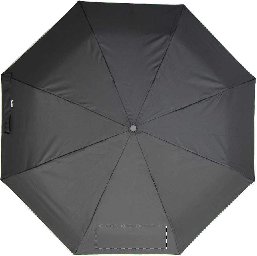 Ombrello pieghevole in pongee RPET 190T completamente automatico (apertura/chiusura), antivento, a 8 pannelli, con finiture argentate, struttura in metallo, stecche in fibra di vetro, manico gommato, custodia rigida ed etichetta RPET.Prodotto a marchio André Philippe.