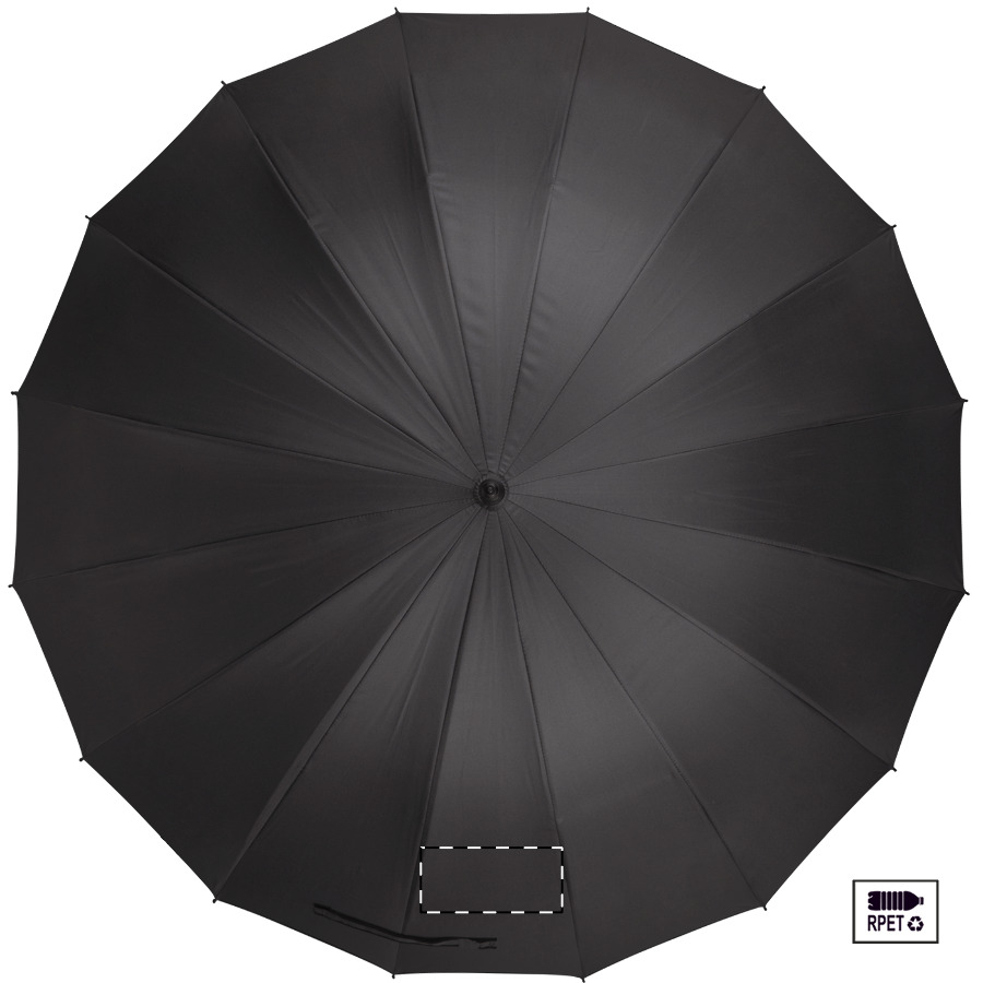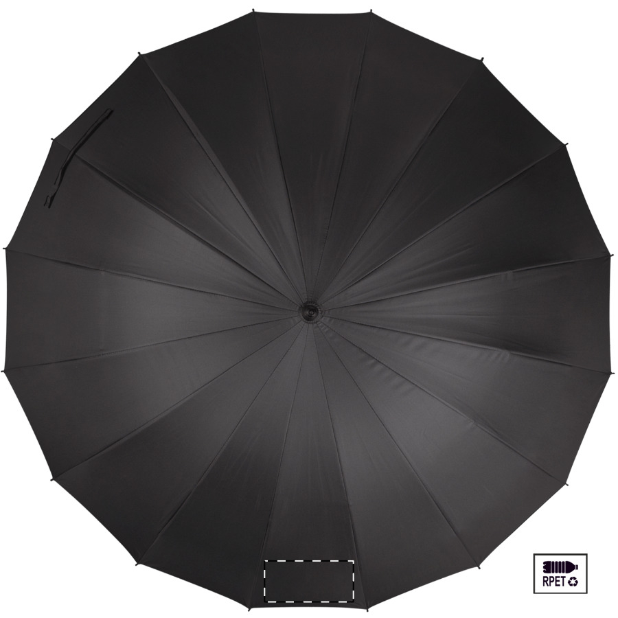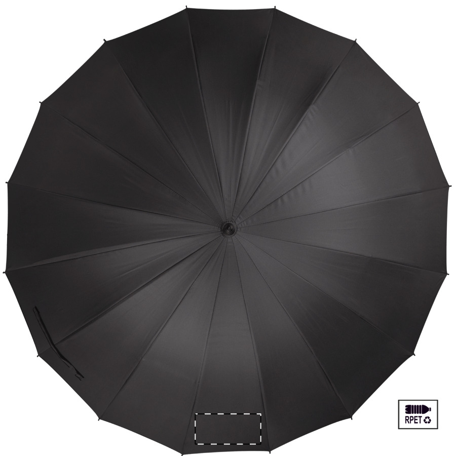 Ombrello manuale antivento in RPET 190T, con 16 pannelli, manico e asta in bambù, struttura e stecche in fibra di vetro. Custodia in colore coordinato ed etichetta RPET