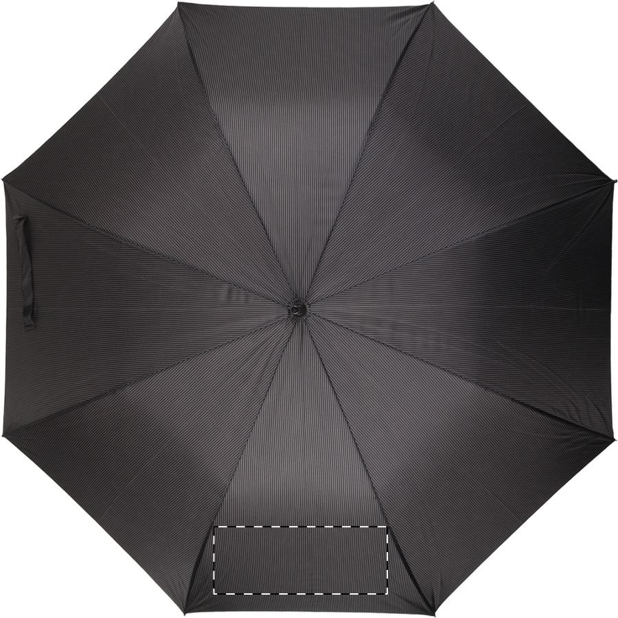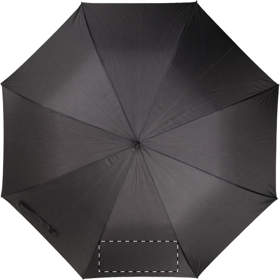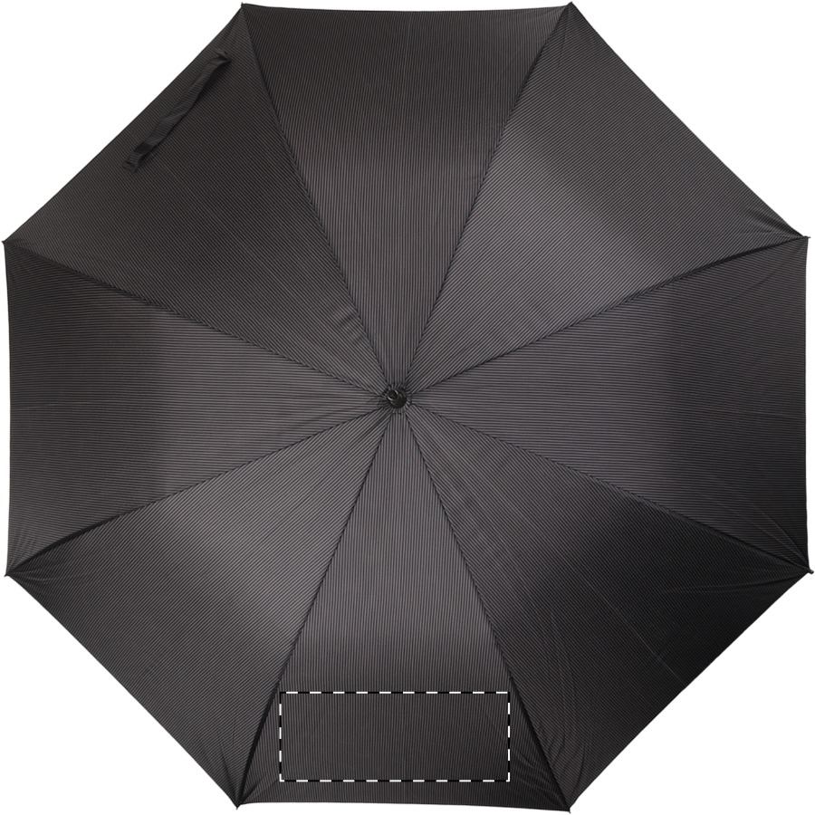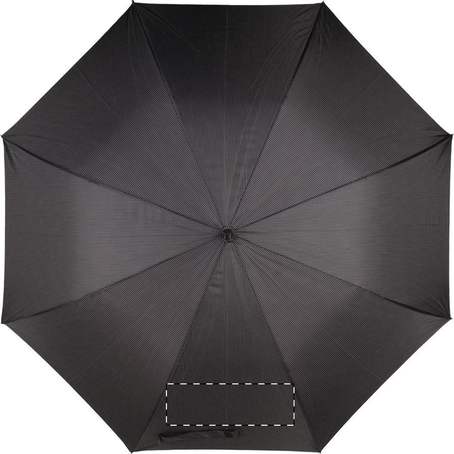 Ombrello a righe nere e grigie, automatico, antivento, con 8 pannelli, manico in legno, struttura in metallo, stecche in fibra di vetro e fodera brandizzata. Materiale: Pongee 190T. Prodotto a marchio André Philippe.