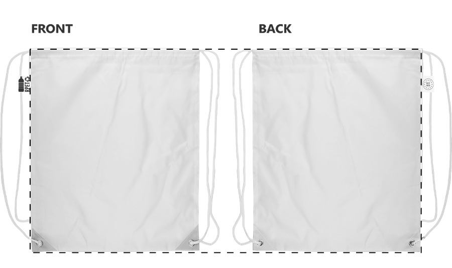 Sacca personalizzata con chiusura a coulisse, angoli rinforzati in pelle PU e cordini in tinta, in poliestere 190T RPET. Con grafica stampata in sublimazione su tutta la superficie ed etichetta RPET. MOQ: 25 pezzi.