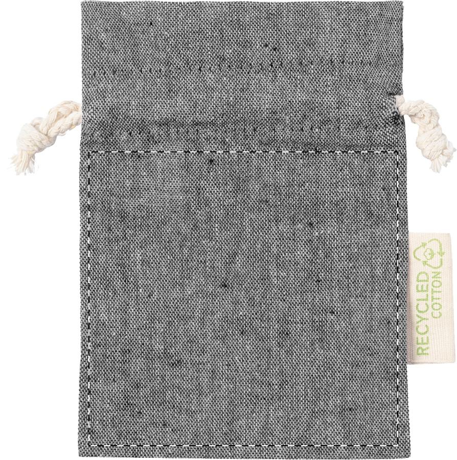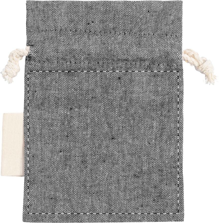Sacca in 100% cotone riciclato da 120 g/m² con chiusura a coulisse ed etichetta cotone riciclato.