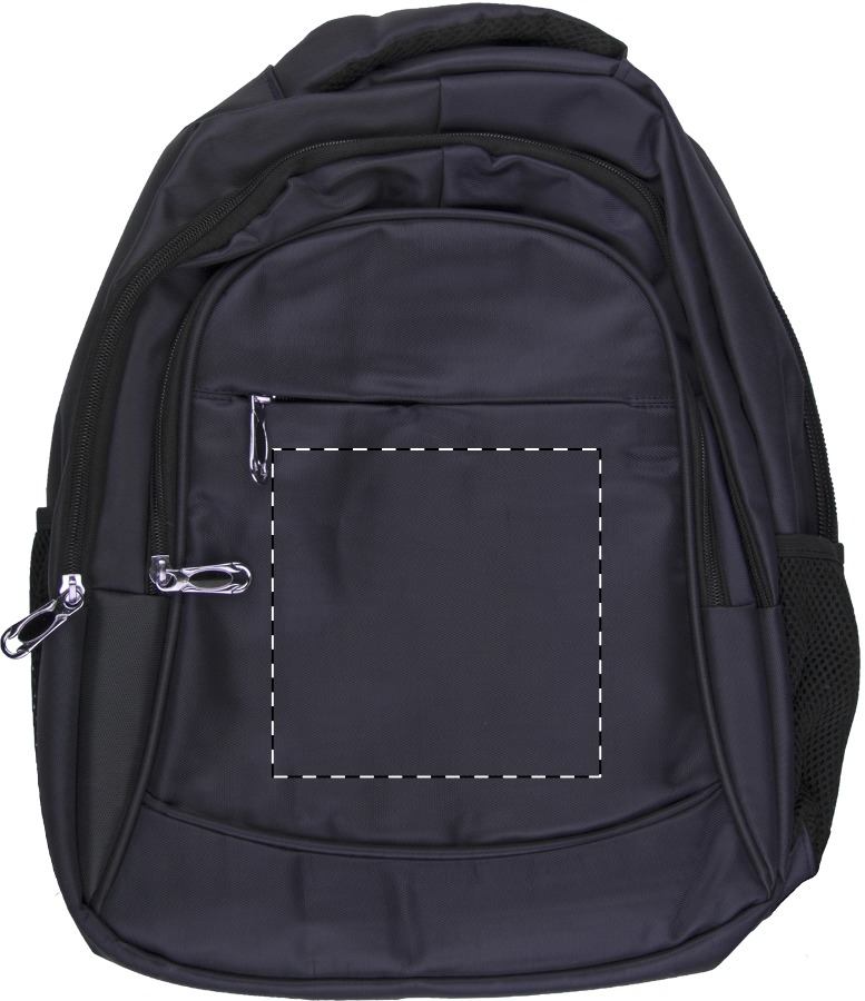 Zaino in nylon 600D con scomparti multipli chiusi da zip, tasca imbottita per laptop (15"), schiena e spallacci.