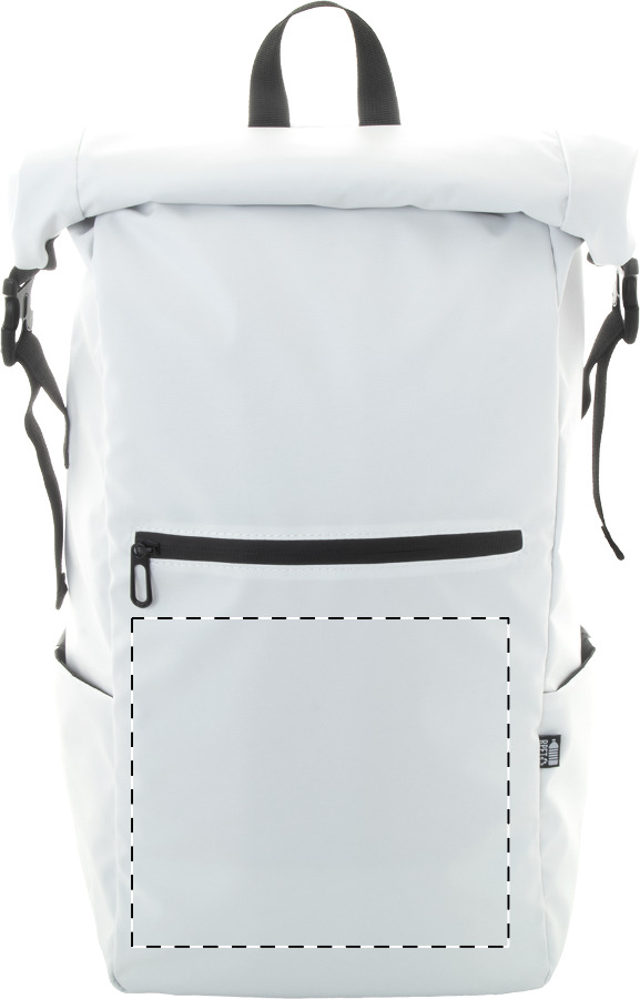 Zaino impermeabile in poliestere 600D RPET spalmato in PU, con chiusura avvolgibile completa di fibbia e velcro, scomparto imbottito per laptop (16") e tablet (10"), tasca frontale con cerniera, tasche laterali, schienale e spallacci imbottiti ed etichetta RPET.