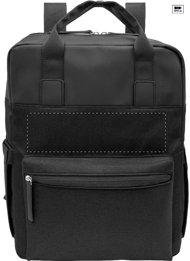 Zaino in poliestere 900D RPET con parte superiore in morbida pelle PU, scomparto e tasca anteriore chiusi da cerniera, tasche laterali, tasca antifurto, cinghia per trolley, schienale imbottito, scomparto per laptop (15") ed etichetta RPET. Confezione con sacchetto antipolvere in tessuto non tessuto RPET.