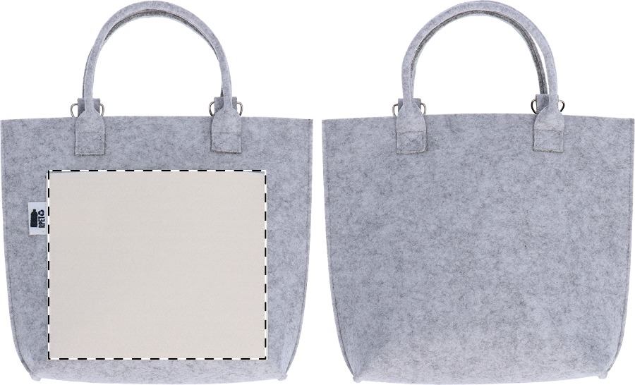 Borsa a tracolla da donna in feltro RPET personalizzabile con stampa a colori sulla tasca frontale. Manici corti, tracolla staccabile ed etichetta RPET. Il costo comprende la stampa in sublimazione. MOQ: 25 pz.