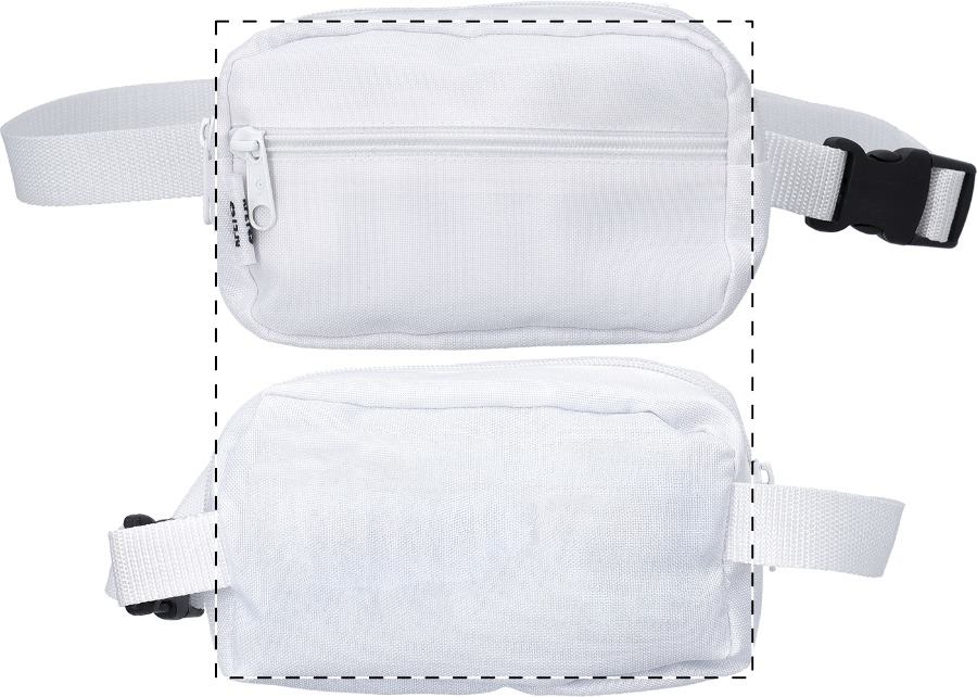 Marsupio in poliestere 600D RPET con scomparto chiuso da cerniera e tasca frontale; personalizzabile con grafica stampata in sublimazione su tutta la superficie ed etichetta RPET. MOQ: 25 pezzi.