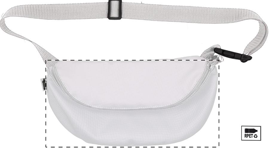Marsupio personalizzabile in poliestere 600D RPET, scomparto con zip e tasca con protezione RFID. Grafica stampata in sublimazione su tutta la superficie, etichetta RPET. MOQ: 25 pezzi.
