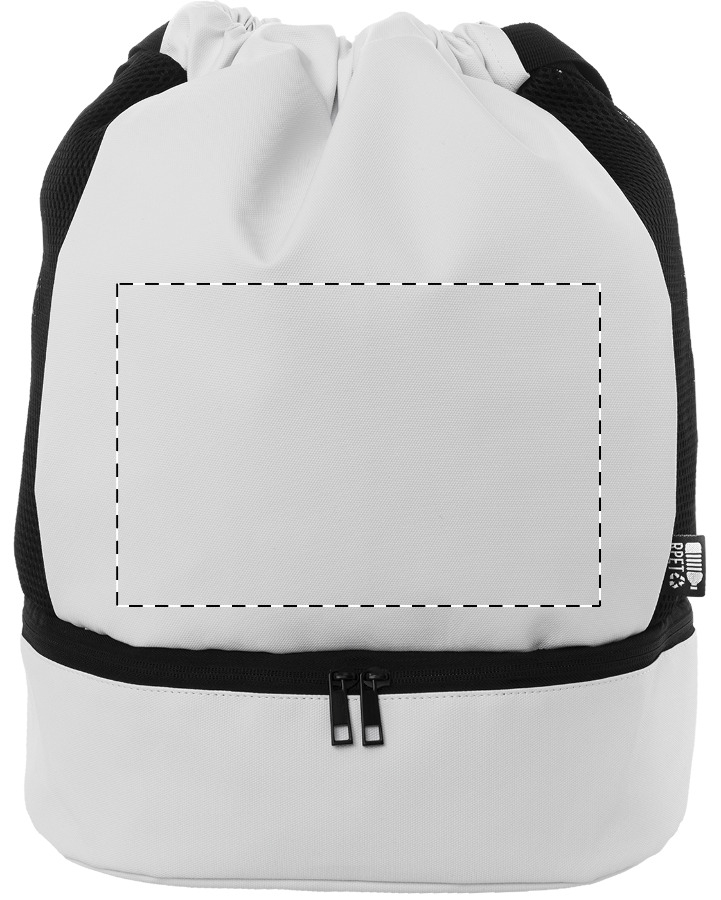 Sacca con chiusura a coulisse in poliestere 600D RPET di prima qualità, rivestimento in PU, scomparto per scarpe chiuso da cerniera, inserti laterali in rete, ampie cinghie ed etichetta RPET.