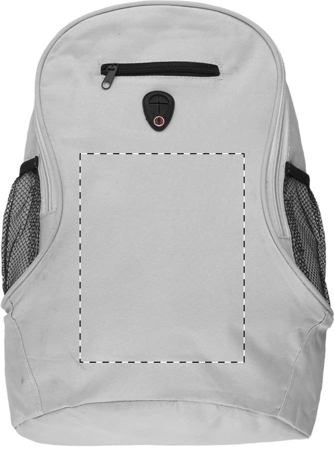 Zaino in poliestere 600D con spallacci regolabili, uscita per auricolari, tasche laterali in rete, tasca per cellulare con zip e scomparto principale.