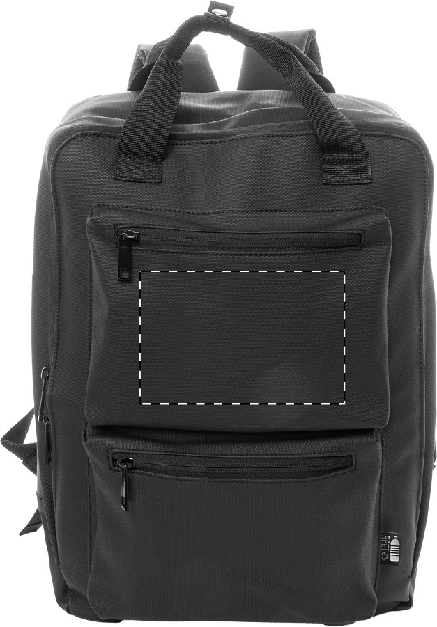 Zaino impermeabile in RPET con scomparto principale con cerniera, 2 tasche anteriori con cerniera, tasche laterali e scomparto imbottito per laptop (15") e tablet (10"). Con schienale e spallacci imbottiti. Poliestere 600D RPET rivestito in PU, con etiche