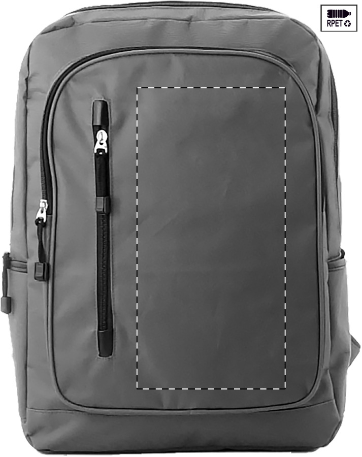 Zaino in poliestere 600RPET con scomparto principale e 2 tasche anteriori chiusi da cerniera, tasche laterali, scomparto imbottito per laptop (15"), schienale e spallacci imbottiti ed etichetta RPET.