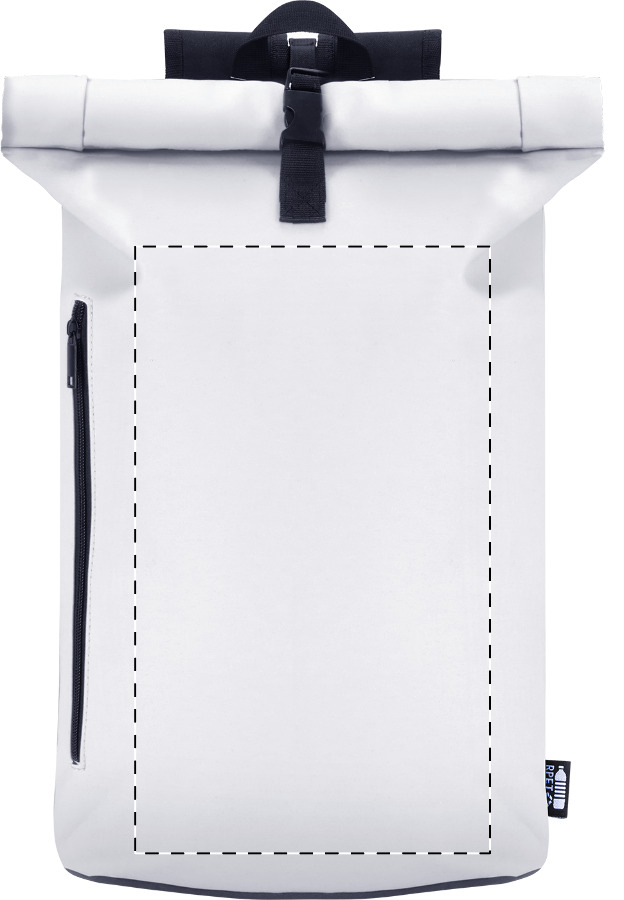 Zaino rolltop impermeabile in morbida pelle PU riciclata con chiusura a fibbia, tasca frontale con cerniera, scomparto imbottito per laptop (15"), schienale e spallacci imbottiti ed etichetta PU riciclato.
