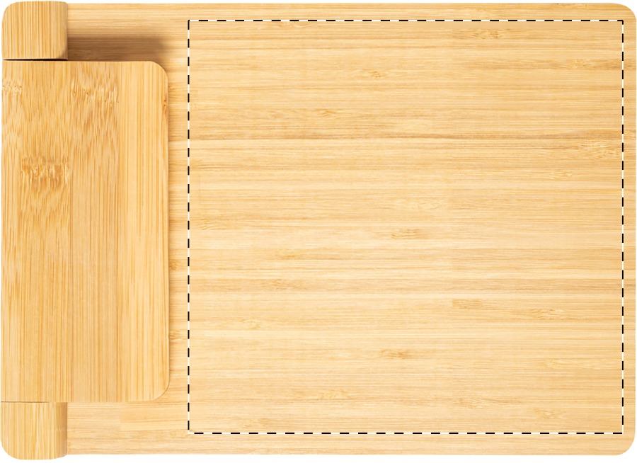 Tagliere in bambù con set di 4 coltelli da formaggio in acciaio inox su supporto magnetico pieghevole.