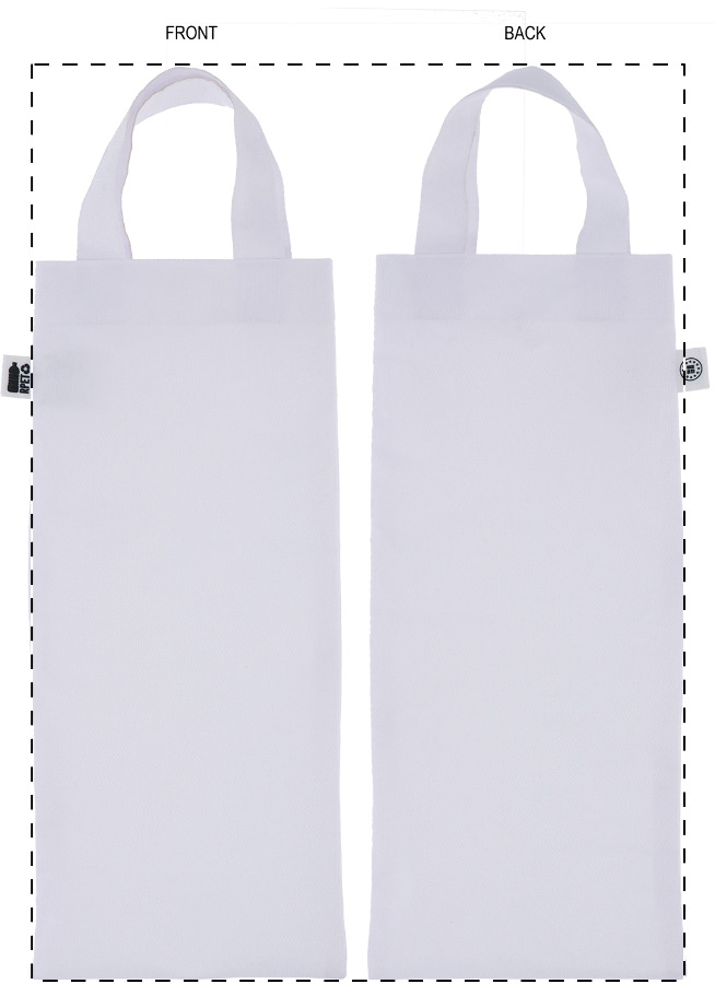 Borsa per bottiglie di vino in poliestere 600D RPET con manici corti, personalizzabile con grafica stampata in sublimazione su tutta la superficie ed etichetta RPET. MOQ: 25 pezzi.