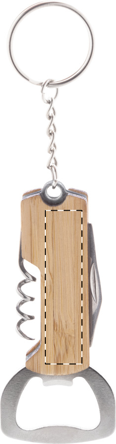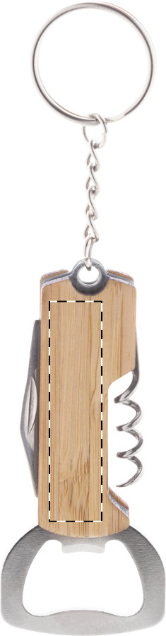 Portachiavi apribottiglie in bambù e acciaio inossidabile con cavatappi e coltellino.