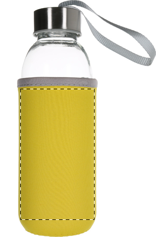 Borraccia da 420ml. in vetro con rivestimento in neoprene colorato. Non adatta per l'utilizzo con bevande gassate.
