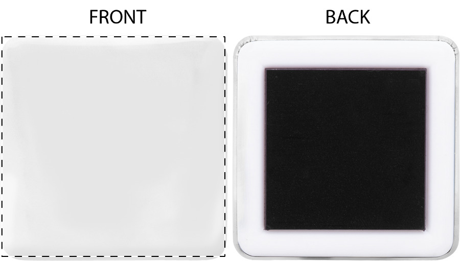 Magnete frigo quadrato con inserto cartaceo personalizzabile a colori. Il prezzo include la stampa digitale. MOQ: 100 pezzi.