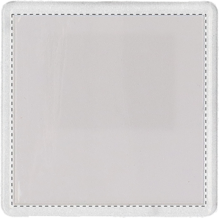 Magnete da frigo in acrilico di forma quadrata con inserto in carta personalizzabile a colori. Il costo comprende la stampa digitale. MOQ: 100 pezzi.