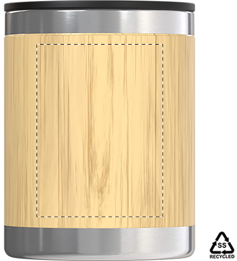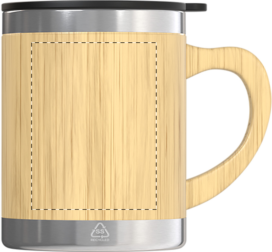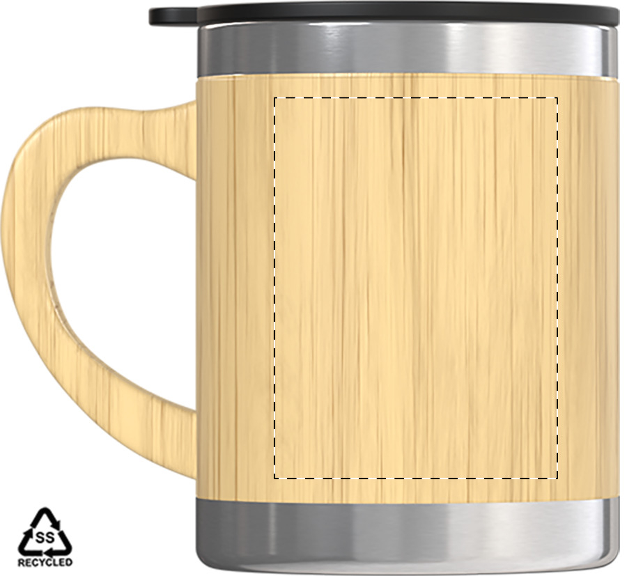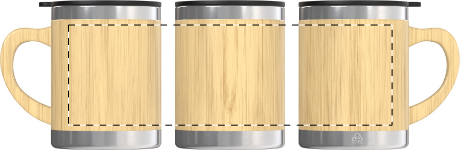 Tazza mug termica in acciaio riciclato a doppia parete da 300ml., con rivestimento e manico in bambù e coperchio erogatore in PP.