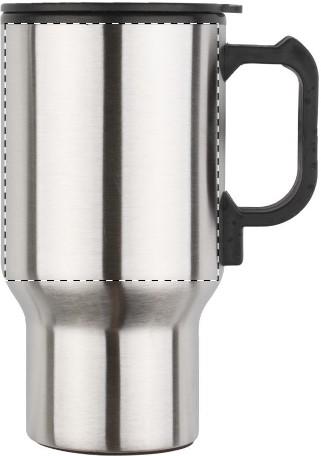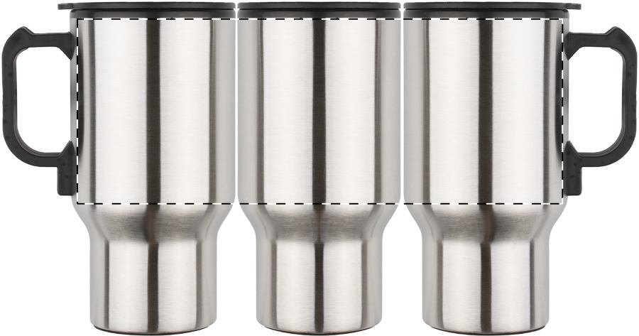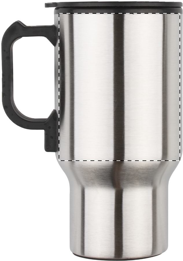 Termo tazza 450 ml. riscaldabile in metallo con coperchio in plastica e manico. Con attacco accendisigari.
