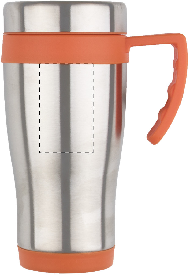 Tazza termica 450 ml. a doppia parete in acciaio inox con manico e parti in plastica colorata, in confezione regalo.
