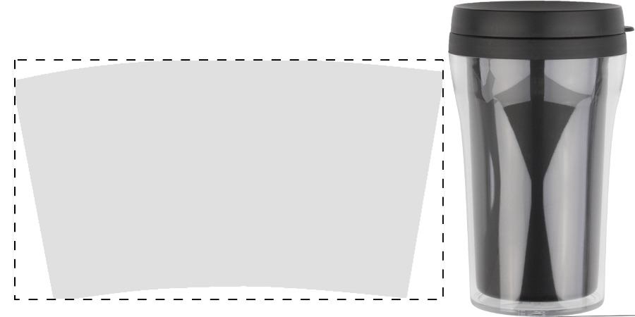 Mug termico da 250ml. in plastica a doppia parete con tappo. La grafica personalizzata può essere posizionata tra le 2 pareti del mug. Confezione in scatola bianca.
