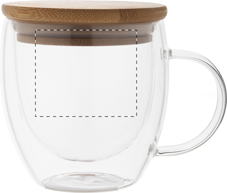 Tazza mug termica da 250 ml. a doppia parete in vetro borosilicato con manico e coperchio in bambù. Confezione in scatola di cartoncino kraft.