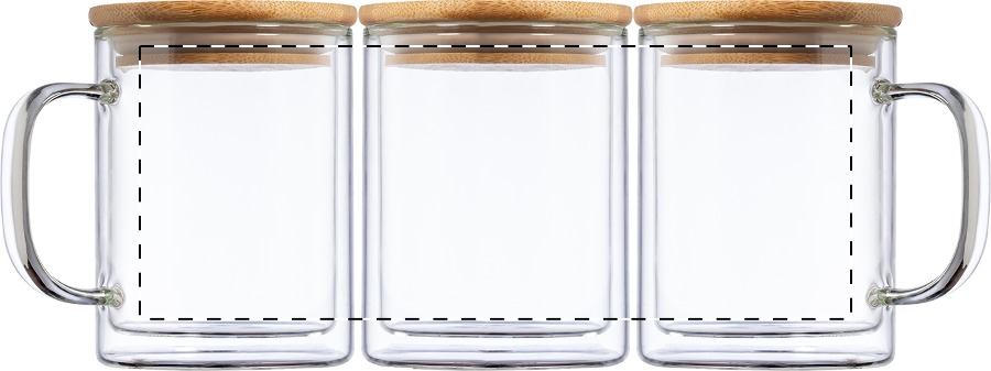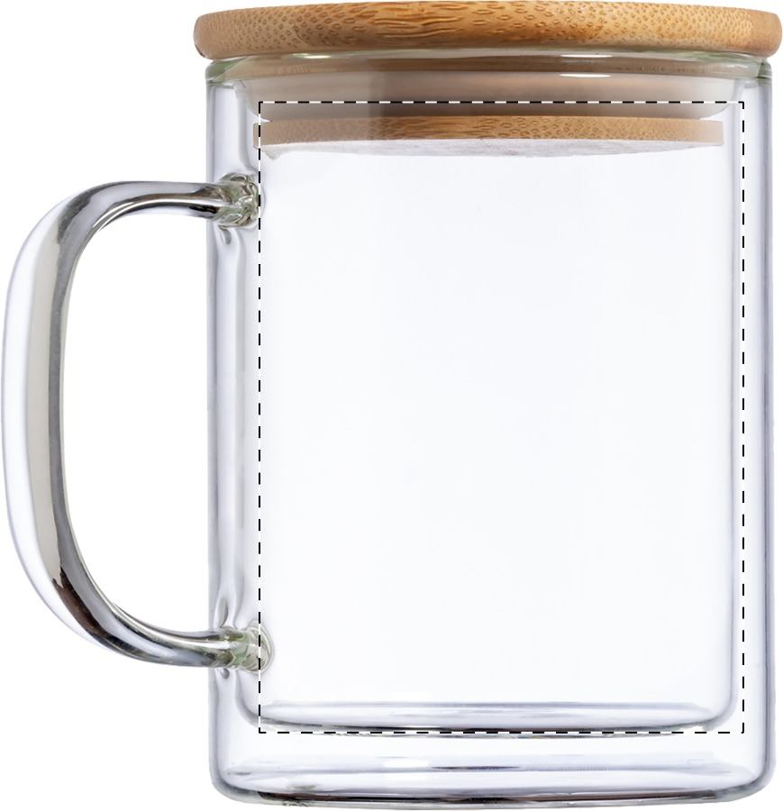 Tazza termica in vetro borosilicato a doppia parete da 370 ml., coperchio in bambù e confezione di cartoncino kraft.